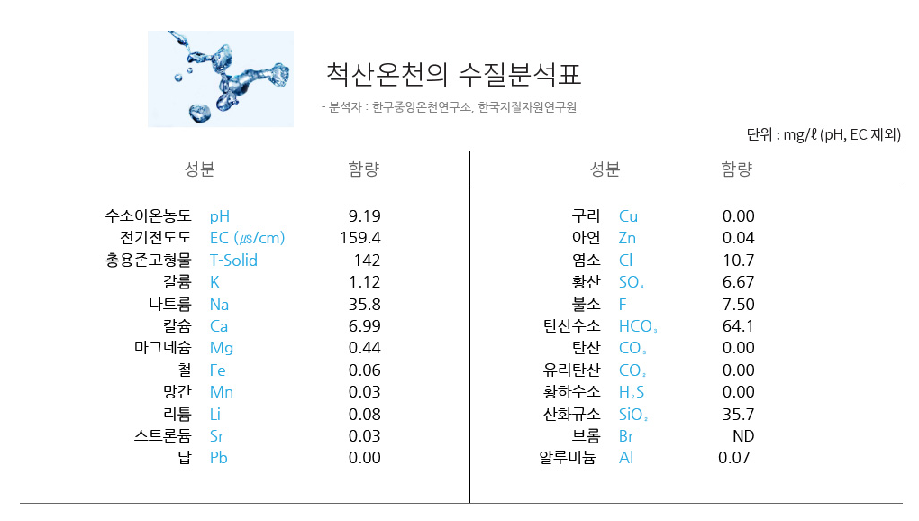 척산온천장의 온천수는 알칼리성으로, 특히 **불소(F)**와 라돈(Rn) 성분이 다량 함유되어 있어 피부 미용과 피로 회복에 탁월한 효과가 있다고 알려져 있습니다. 이 온천수는 체내에 유익한 물질들이 다수 포함되어 있어, 피부질환, 눈병, 위장병, 신경통, 류머티즘 등 다양한 질환에 긍정적인 영향을 미칩니다.