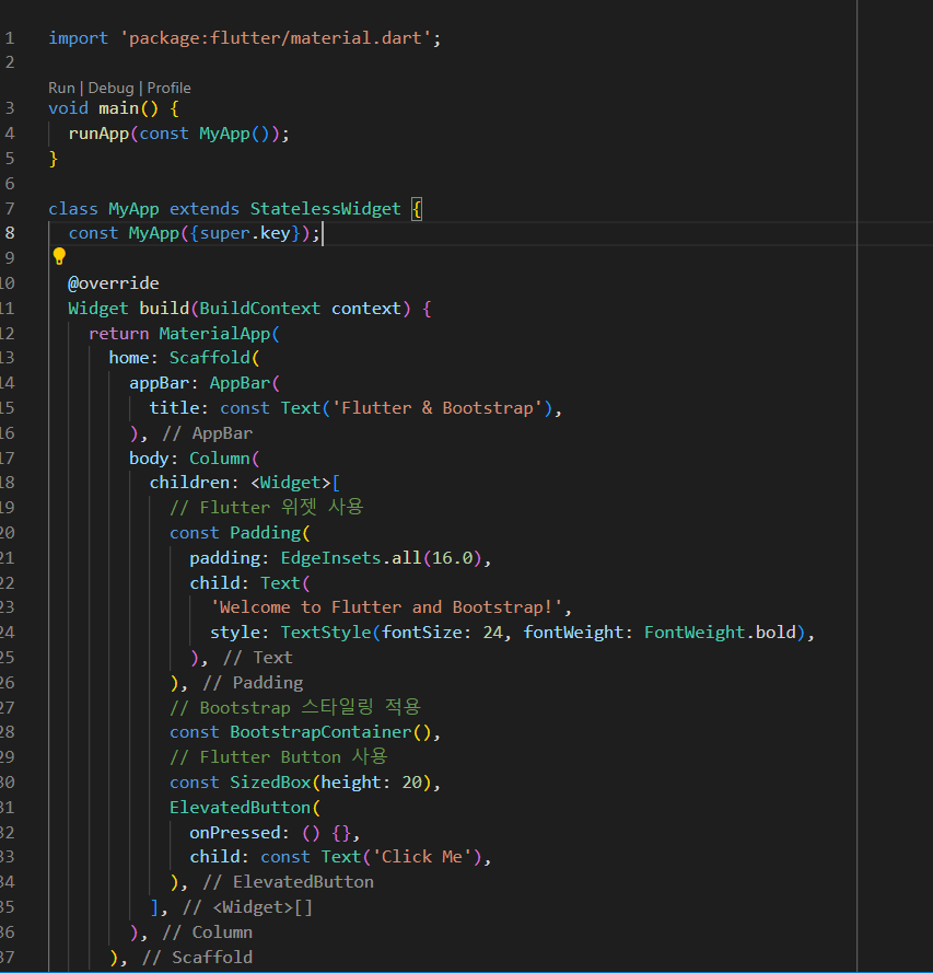 12강: Bootstrap 폼 디자인 및 연동내용 요약Bootstrap을 사용한 폼 디자인:Bootstrap은 웹에서 폼을 디자인할 때 유용한 CSS 클래스를 제공합니다. 간결하고 반응형 폼을 쉽게 만들 수 있으며, 다양한 입력 필드, 버튼, 레이아웃 옵션을 제공합니다.Bootstrap 폼 구성 요소:form-group: 폼 필드를 그룹화하는 클래스.form-control: 텍스트 입력 필드, 선택 상자 등의 스타일링을 위한 클래스.form-check: 체크박스와 라디오 버튼의 스타일링을 위한 클래스.btn: 버튼 스타일링을 위한 클래스.Flutter와의 연동 방법:Flutter 웹 프로젝트에서 Bootstrap을 활용하여 폼을 디자인한 후, 사용자 입력을 처리할 수 있습니다.Bootstrap 폼을 Ht..